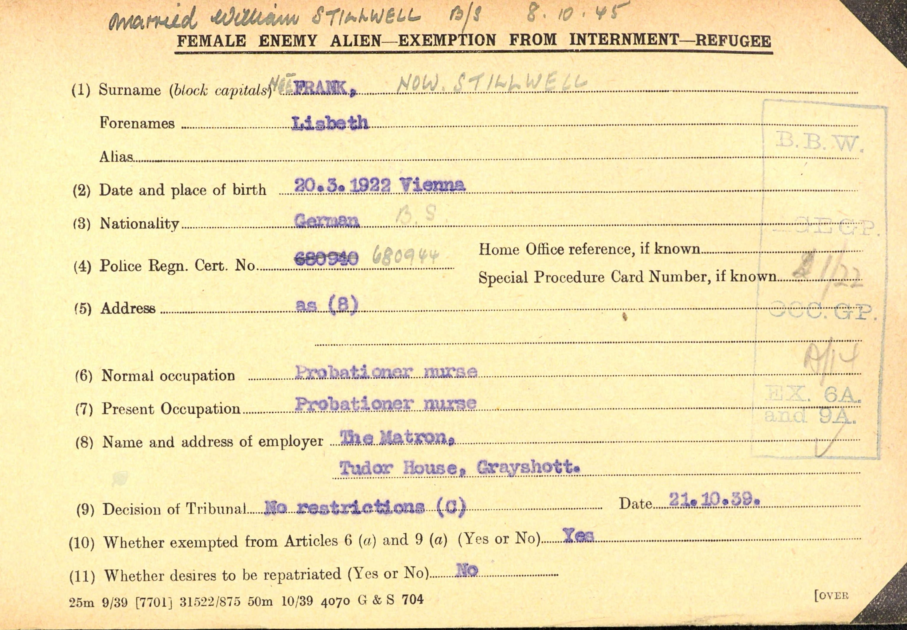 As Lisbeth was working as a nurse during the war, it is quite possible that she met Stilwell while caring for him at a hospital after he was injured. But this is conjecture. In any case, according to her internment exemption card she was employed at Tudor House in Grayshott as a probationary nurse. Grayshott was an Army town, hosting barracks and training camps, and the Military Hospital in Tudor House. Stilwell was 13 years her senior.